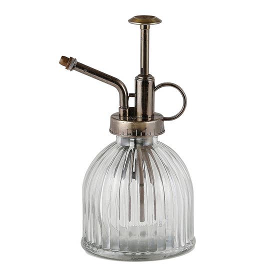 Save water! Use a mister! The charming way to water your plants. Chic glass mister mists plants using a refillable glass container. Glass/ plastic/ brass. 6" h x 3" bottom diameter.